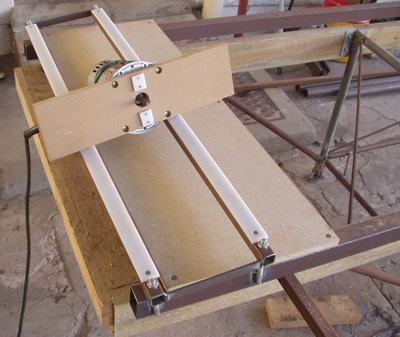 | Two rails with a polyethylene low friction strip attached will guide the router at the chosen angle of 1 : 8. No-one can weld to the accuracy required for the guides to be in perfect alignment to generate the sloped plane across the full width and indeed the same slope at either end. So it is good engineering practice to add adjusting elements. These are made from threaded rod and nuts above and below the guide rail. It is now a simple matter to 'tune' the slope with a little spanner work. A few test runs on scrap plywood will help. This completes the jig itself. The router needs a custom base to straddle the rails and stops to keep the router bit from gouging into the rails. The picture at right shows this quite clearly, whereas the one above shows how the router with the new long base is positioned on the jig. The width of the jig is based on the widest scarf you expect to make, mine is 1 meter / about 39" wide. |