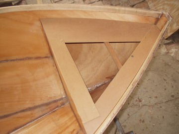 | Seat tops being glued to sub structure using a combination of temporary screws and weights. | Foredeck template made up of three strips of hardboard. This way one only has to fit up one outside curve and it uses very little hardboard! |