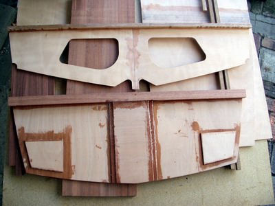 Transom stiffeners being glued on. Transom, mid bulkhead displayed on rudder and dagger board blanks. |
