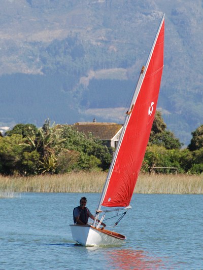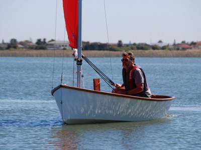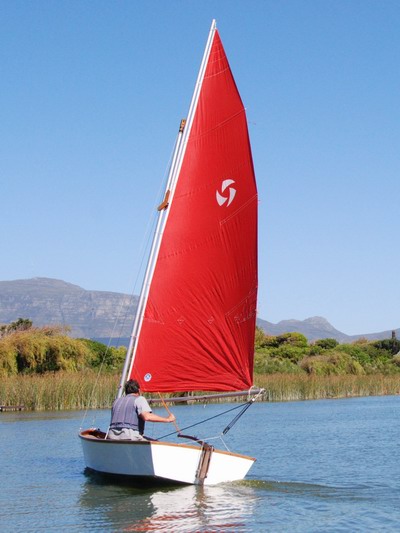 Pictures of the 'Piragua' under sail :The "Piragua" has been sailed extensively since her launch last year. I used the rig and main sail of the "Swift" because it was to hand. Recently my son took a whole lot of pictures of me sailing her and I present here a small selection.We had a moderate breeze but still managed to get a few pics of her showing off her clean lines. Since taking these pictures, "Piragua" is now rigged with a fully battened, square-top main on a free standing, rotating mast. See 'Piragua' sailing with new rig |